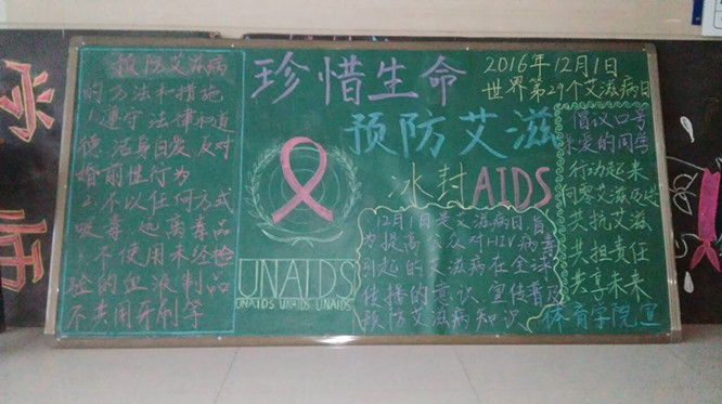 12月1日是第24个世界艾滋病日。在世界艾滋病日来临之际,体育学院制作了“珍爱生命,预防艾滋”的宣传板报。体育学院分团委学生会宣传部负责此次板报的绘图与设计。板报于2016年12月1日在我校开元校区图书馆门口进行展出。