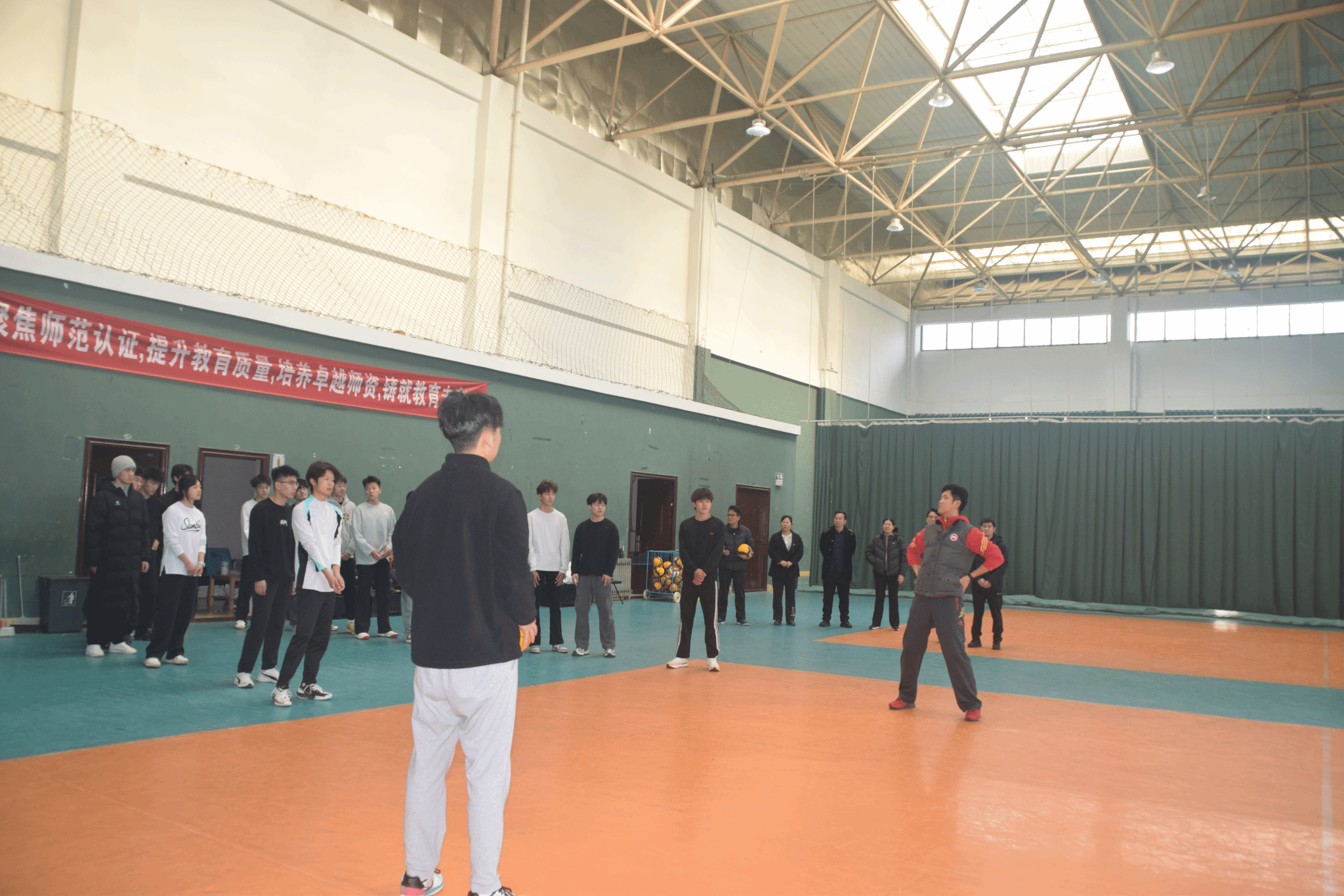 院领导集体查看了主体育场、网球场、风雨操场、篮球场、排球场、田径场等场地,分别旁听了足球、篮球、排球、乒乓球、网球、健美操等课程,认真观察师生授课学习状态。课间,领导们与师生进行亲切交流,对良好的教学效果和课堂氛围给予充分肯定,并从教学内容优化、教学方法创新等方面提出具体指导建议。
