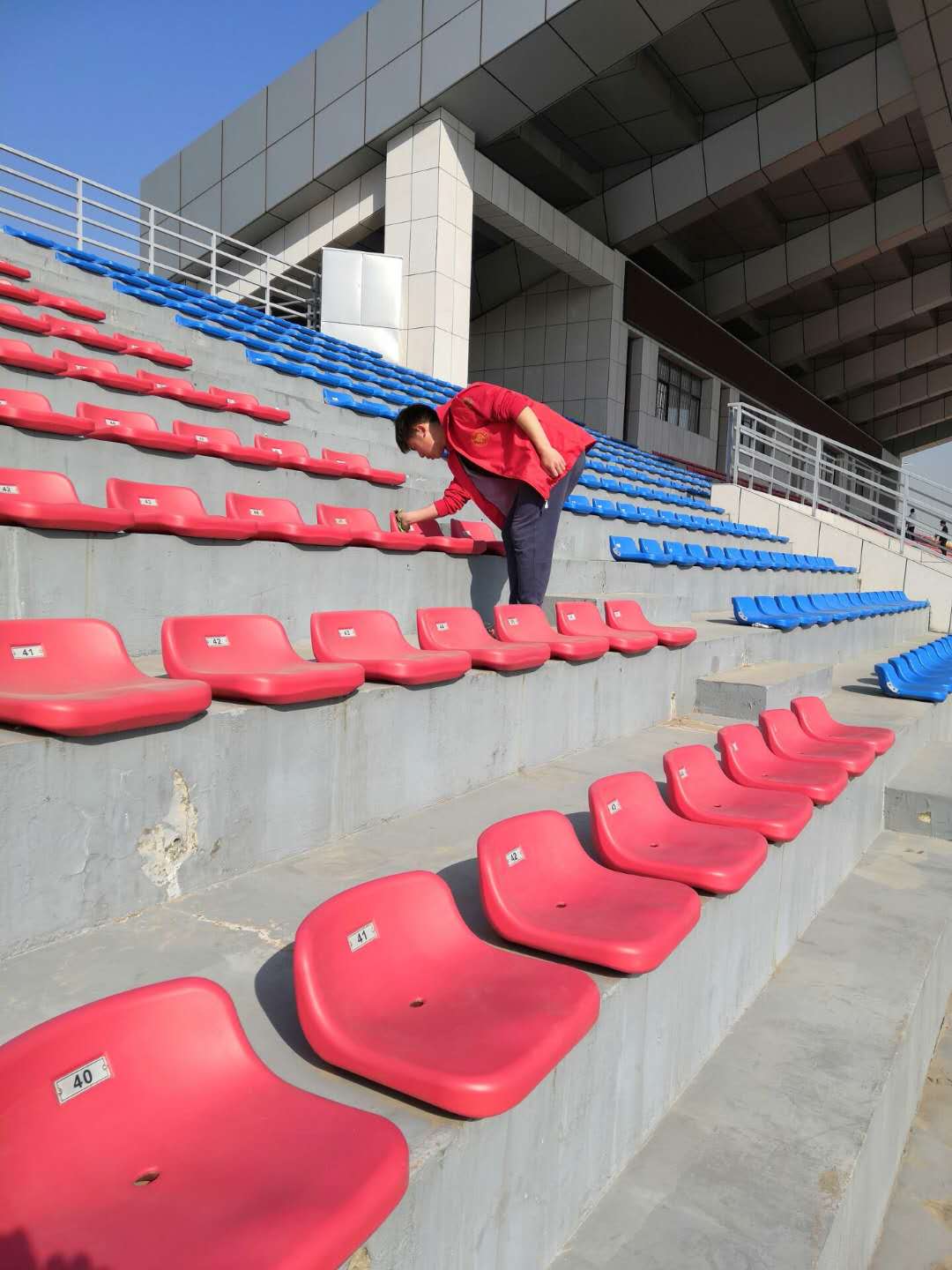 上午九点,志愿者们在田径场南门处集合,经过一系列任务分配,工具分发,活动正式开始。志愿者们在自己所负责的区域内认真捡拾垃圾,擦拭座椅,给大家提供了一个整洁的观看环境。