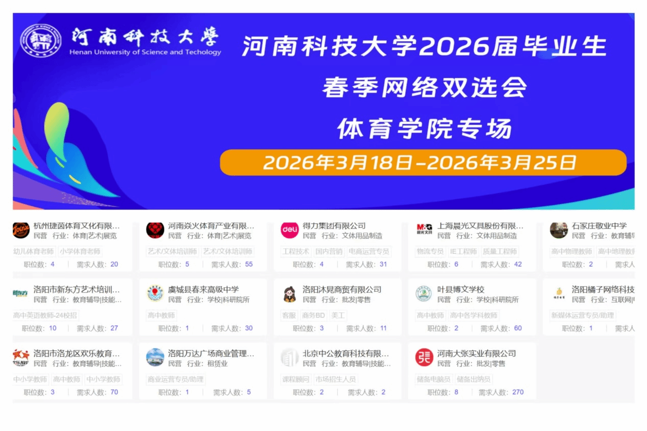 为做好我院2026届毕业生的就业服务工作,搭建毕业生与用人单位之间的沟通桥梁,促进毕业生高质量充分就业,体育学院于3月16-25日在智慧就业平台成功举办了河南科技大学2024届毕业生春季网络双选会(体育学院专场)。